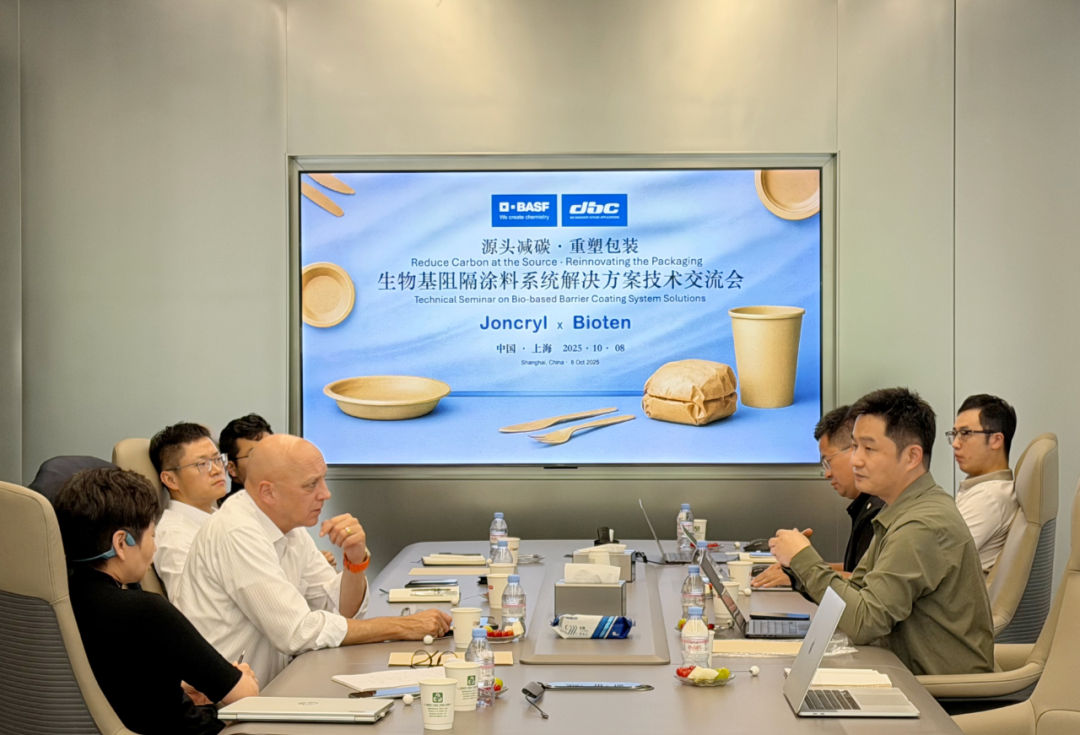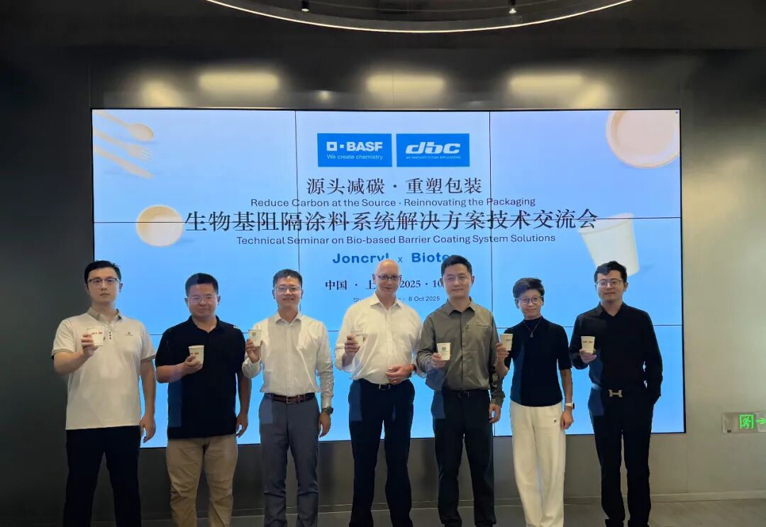 2025年10月8日,都佰城与巴斯夫举办“生物基阻隔涂料系统解决方案”(Joncryl® × Bioten™)低碳阻隔涂层技术交流会。会议聚焦一次性餐具与食品包装应用,围绕新一代低碳生物基水性阻隔涂层的产业化落地路径展开深入研讨,重点讨论阻隔性能与加工效率提升和产线适配。双方共同倡议“源头减碳、重塑包装,以产品力推动行业前进”,并宣布以“标准对齐 + 工艺验证”的方式,加速生物基阻隔技术方案在多场景、全球化的应用落地。